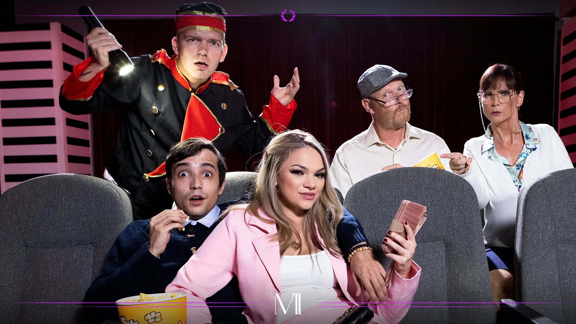 Athena pulls out her phone and starts chatting away with Ricky, showing a total lack of respect for the other people in the theatre. Syren isn't shy to give her a piece of her mind, and she promptly tells Athena to keep quiet. Athena scoffs, begrudgingly putting her phone away while trying her hardest to find some sense of enjoyment in the boring movie in front of her. But then she gets a sneaky idea. She lifts the divider between her and Ricky and starts rubbing his crotch through his pants. She then pulls open his zipper and takes his cock out and starts jerking him off. Syren and Dick can see everything, and they are incensed. Syren demands that Athena and Ricky change their behavior, but it's clear that these teens aren't going to listen.